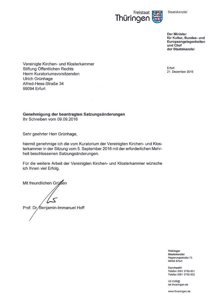 Mit dem neuen Ressortzuschnitt der Landesregierung nach der Wahl 2014 aber auch der Fusion der Evangelischen Landeskirchen zur EKM wurden redaktionelle Änderungen der Satzungsinhalte notwendig. Darüber hinaus wurden zwischen dem letzten Satzungserlass in 1999 bis heute fast ununterbrochen vielfältigste Diskussionen über das Verständnis der Rechtsgrundlagen der Klosterkammer mit den beteiligten Ministerien geführt. Die endlich darüber erzielten Übereinstimmungen haben teils deklaratorisch, teils in Ergänzung inhaltlicher Bestimmungen nunmehr Eingang in die neue Satzung gefunden, auch um dem Stifterwillen der in der Klosterkammer aufgegangenen Vorläuferstiftungen und Fonds angemessen Rechnung zu tragen. Die neue Satzung wurde in der Kuartoriumssitzung vom September 2016 einstimmig beschlossen, die ministerielle Genehmigung erfolgte im Dezember desselben Jahres.